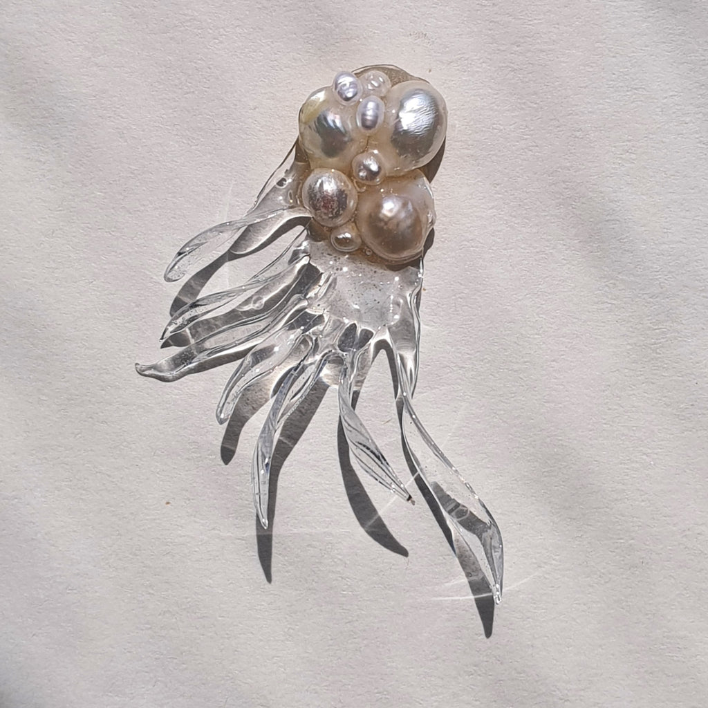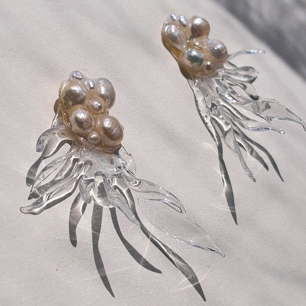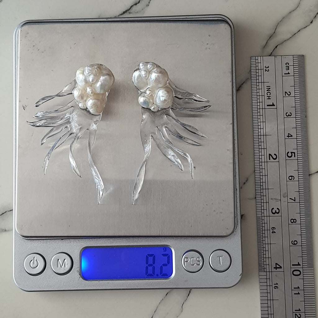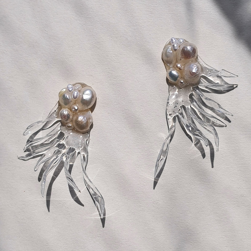 Materialidad: perlas naturales, acrilico fundido revestido en resina y herrajes de plata 950.