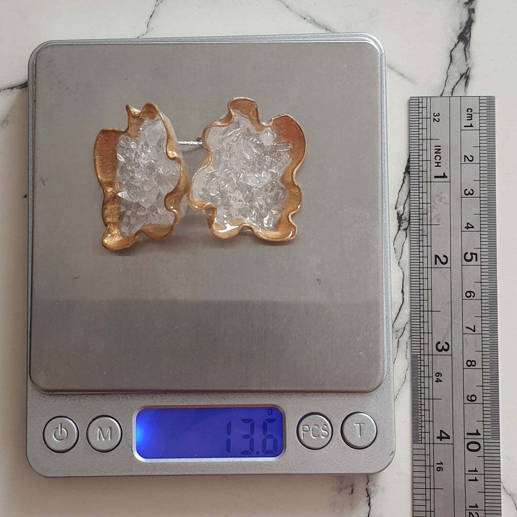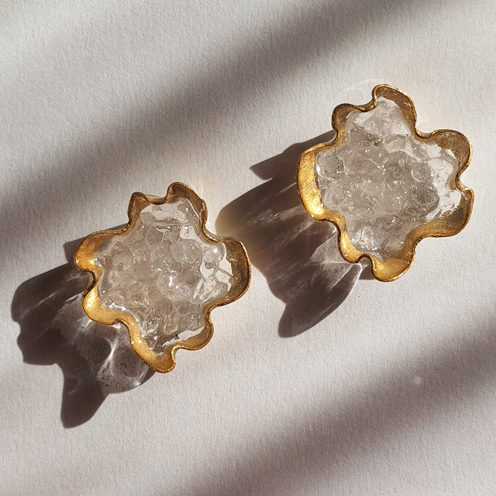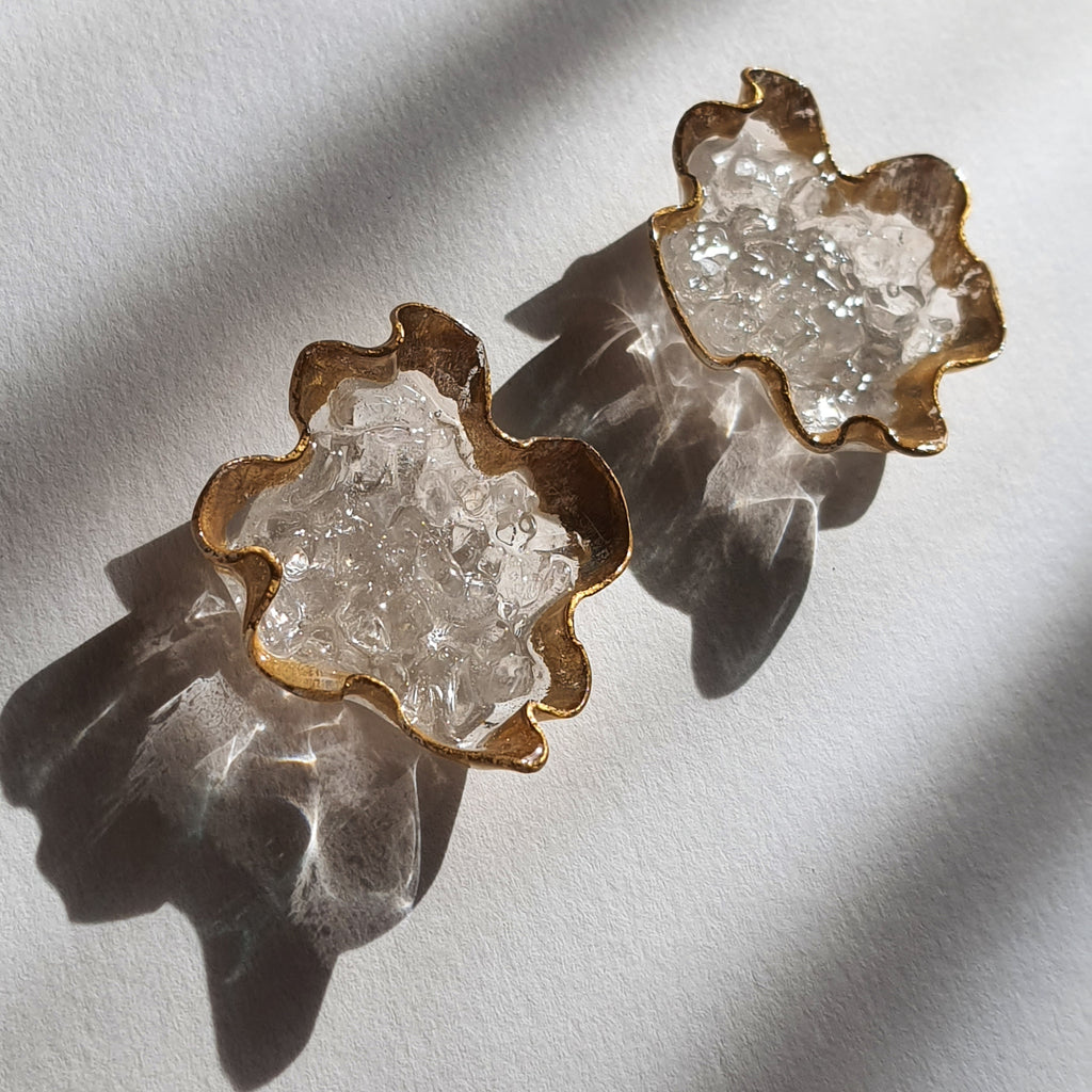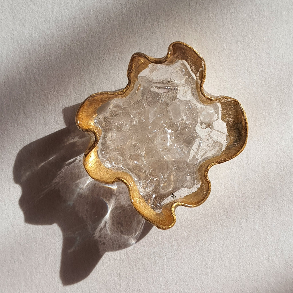 Materialidades: lamina de oro de 22 quilates, cuarzo herrajes de plata 950, acrílico y resina