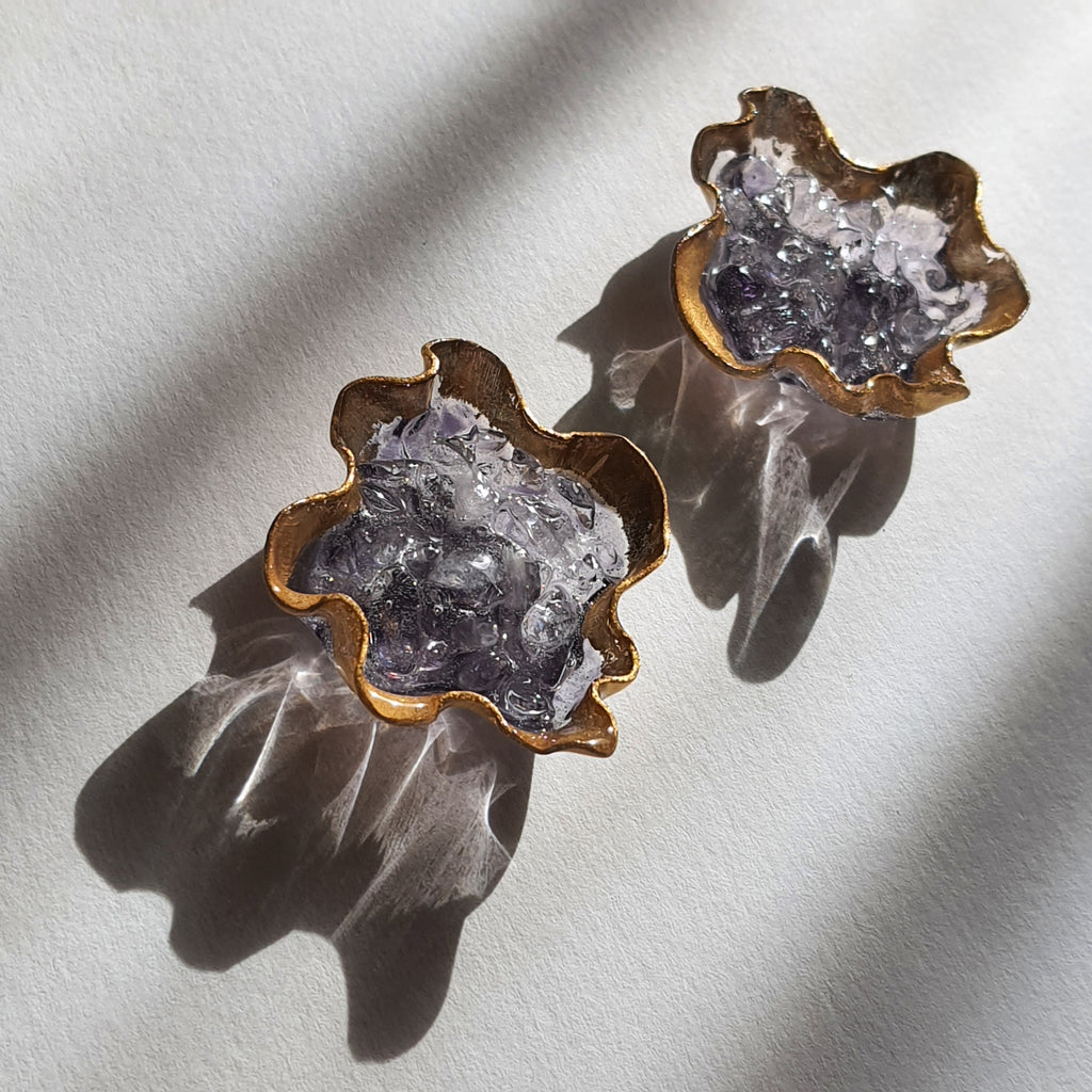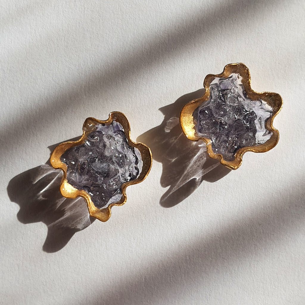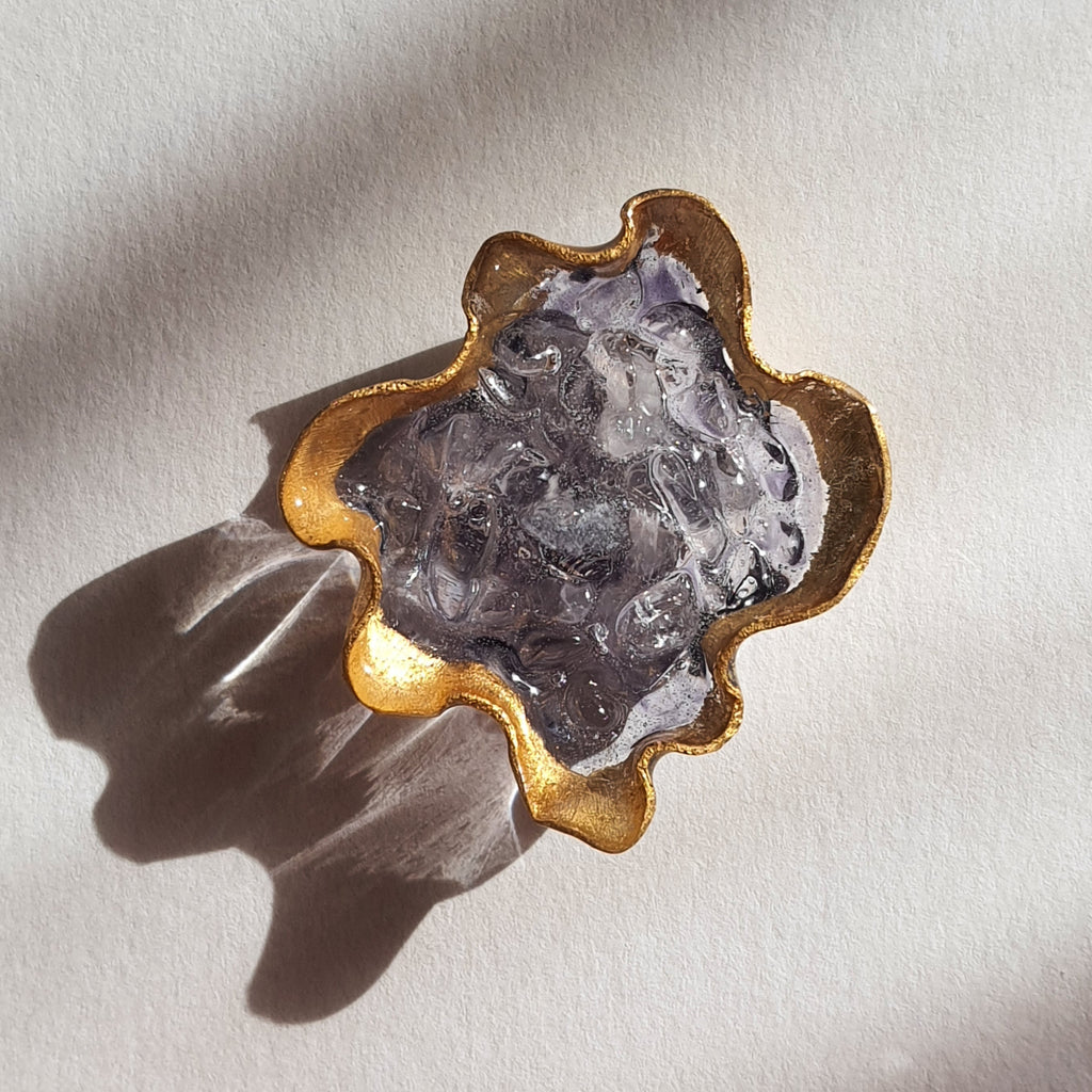 Materialidades: Lámina de oro de 22 quilates, cuarzo, herrajes de plata 950, acrílico y resina