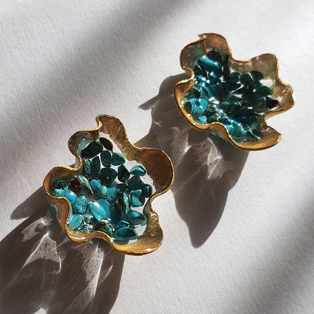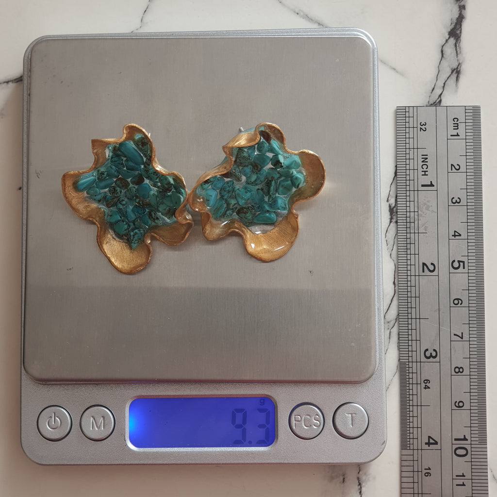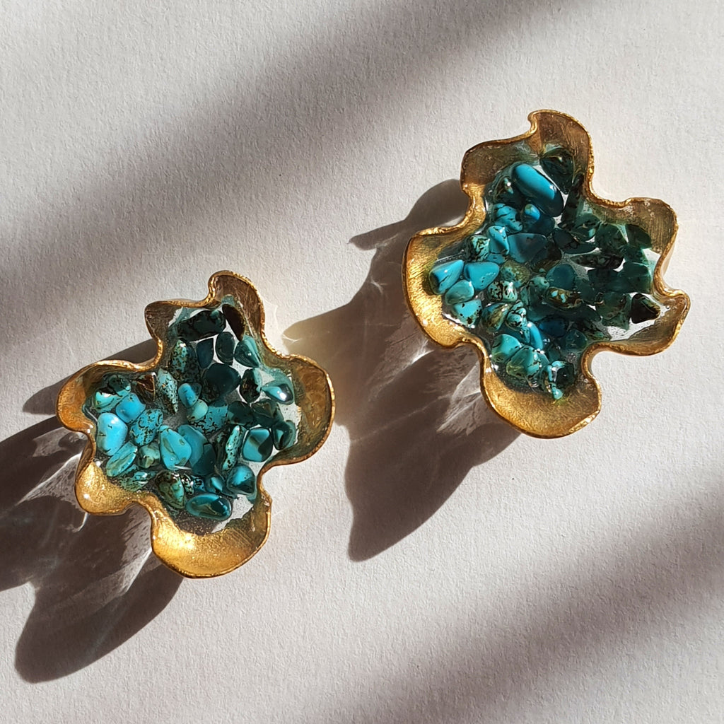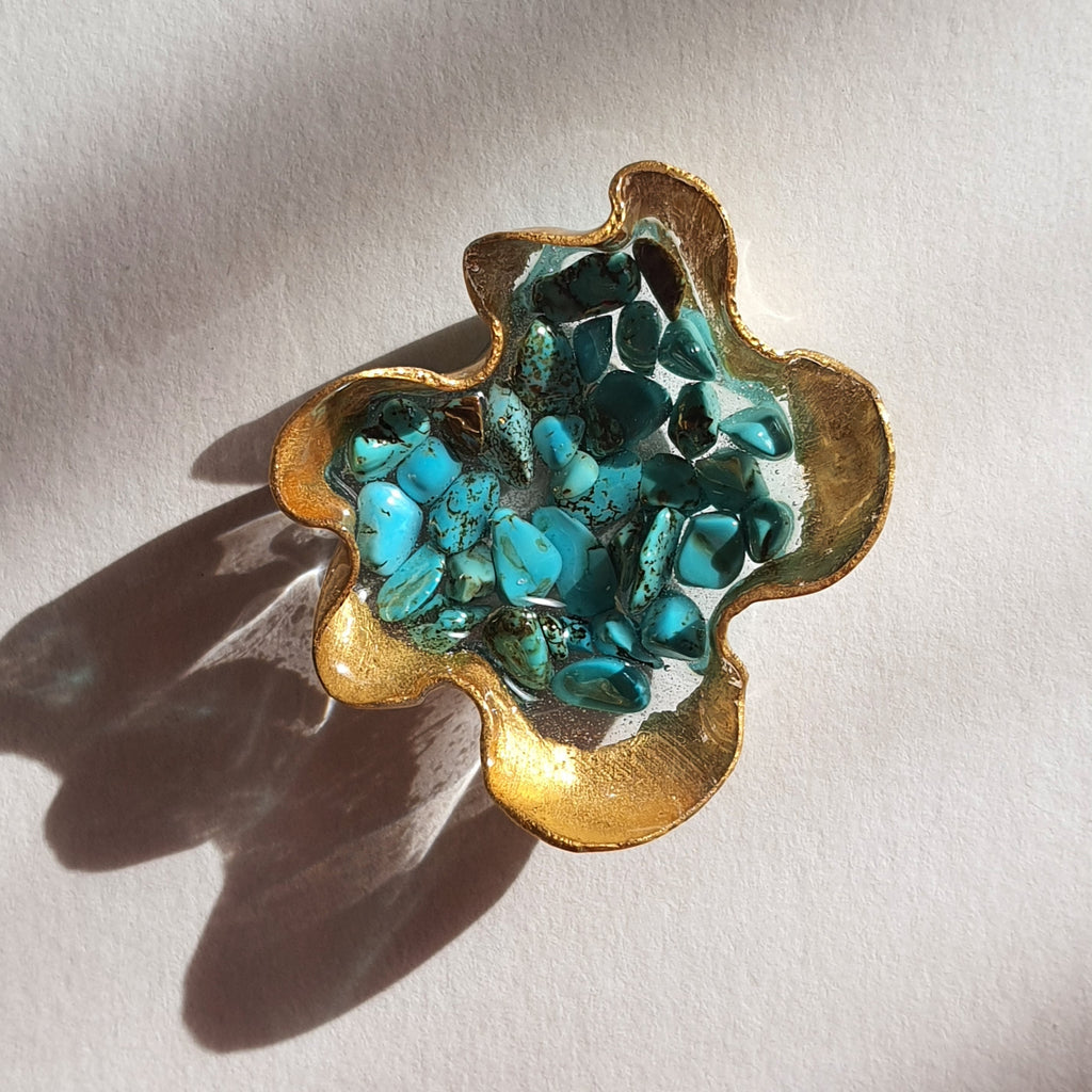 Materialidades: Lámina de oro de 22 quilates, Turquesa, plata 950, acrílico fundido a mano revestido en resina