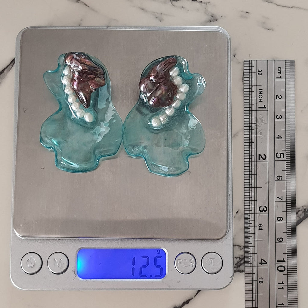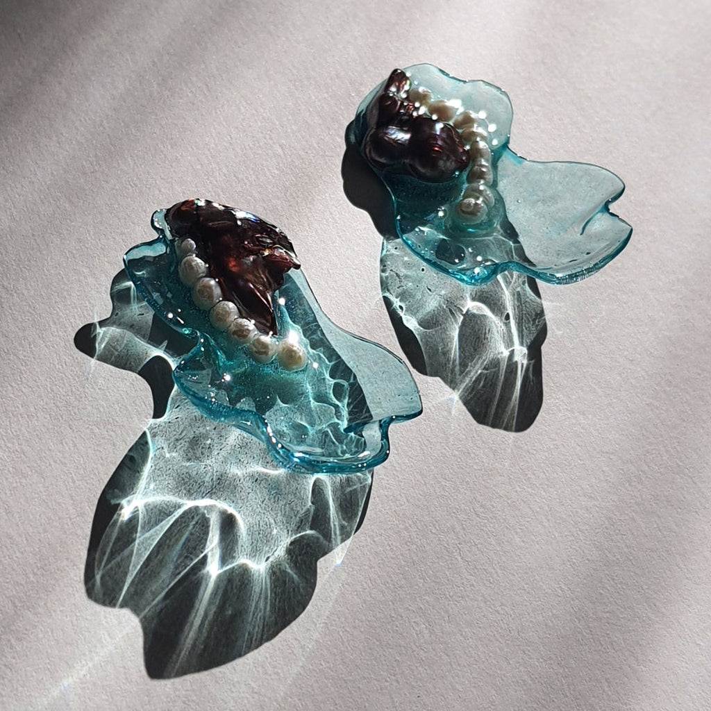 Materialidades: perlas naturales, plata 950, acrílico fundido pintado a mano revestido en resina
