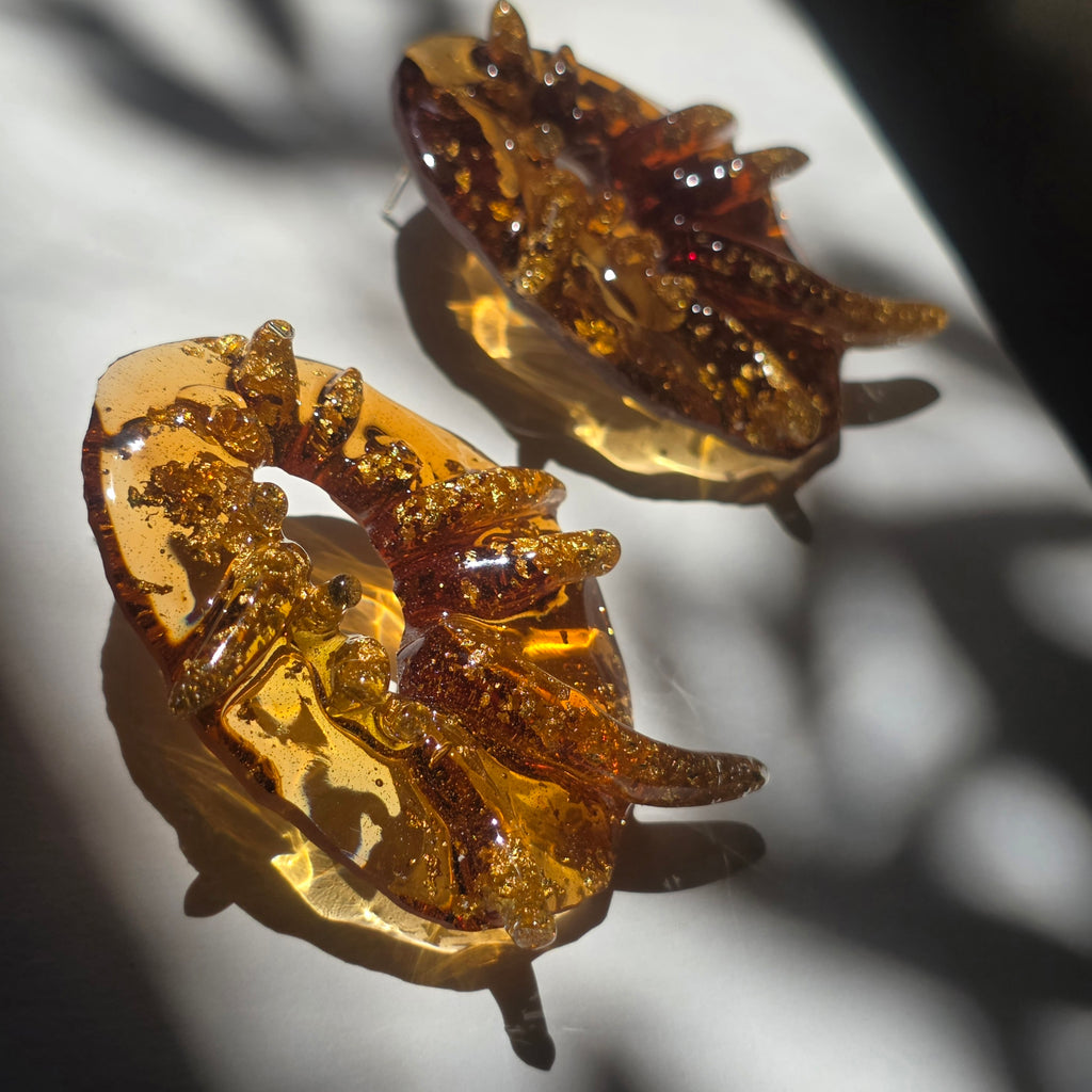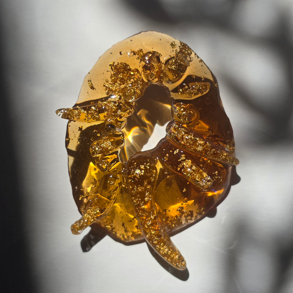 Materialidades: Lamina de oro de 24 quilates, Resina y herrajes de plata 950.