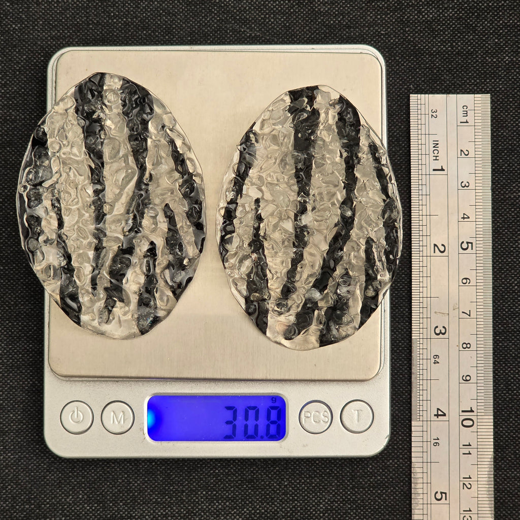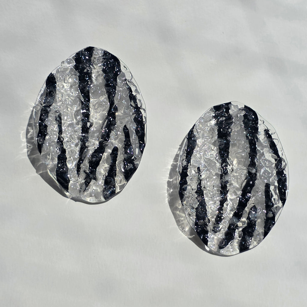 Materialidad: cuarzo, pigmentos, acrilico fundido pintado a mano revestido en resina y herrajes de plata 950.